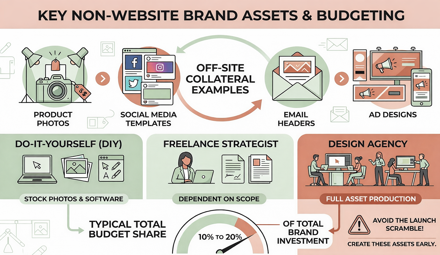 This covers everything that is not the website. Think about product photos, social media templates, email headers, and ad designs. Many e-commerce brands forget to fund this and then have to scramble right at launch.