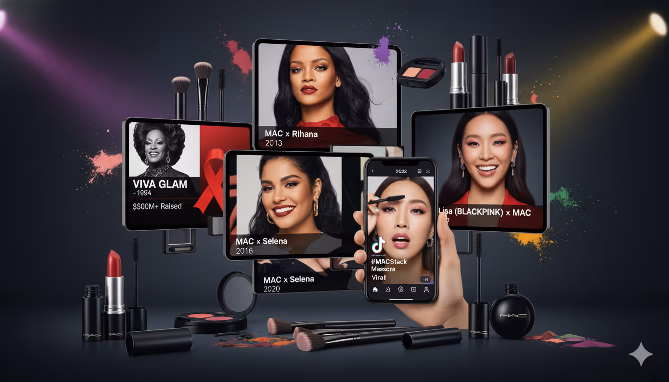 MAC’s marketing thrives on partnerships, from the Viva Glam campaign to artist collaborations that merge pop culture with beauty.