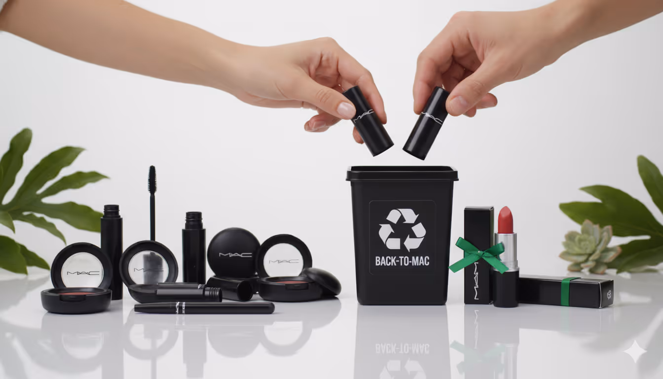 MAC’s Back-to-MAC recycling program encourages customers to return empty containers in exchange for free products, promoting sustainability.